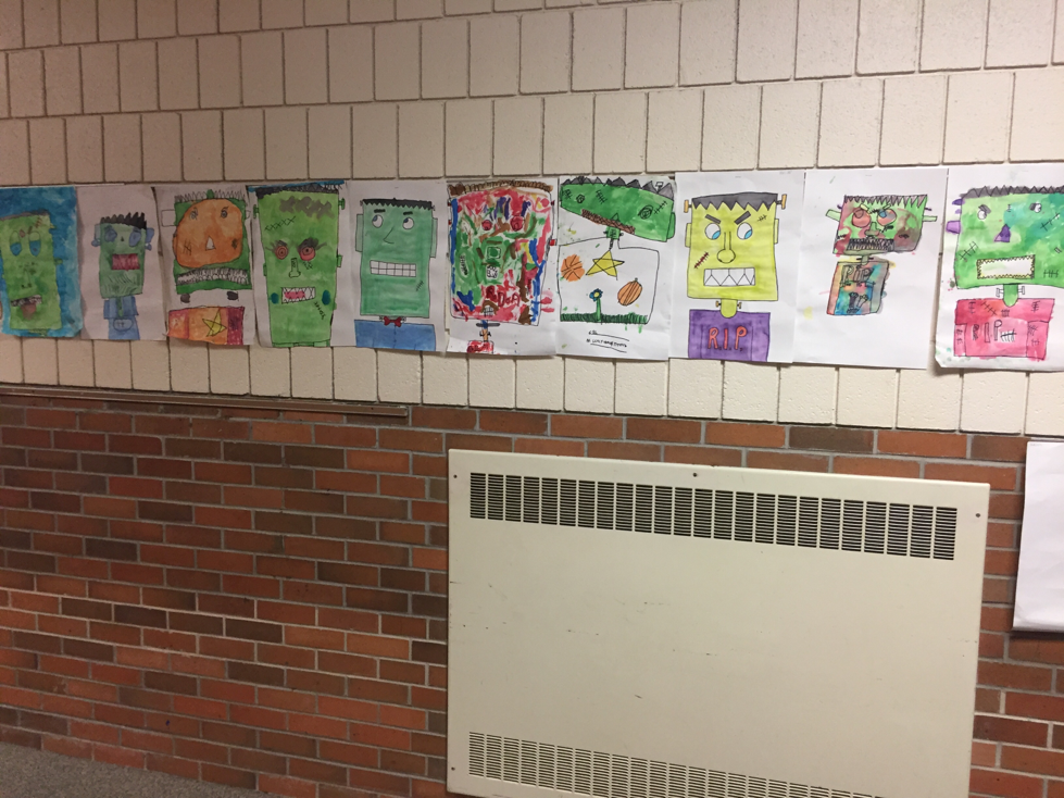 Listening is a large part of the Language Arts standards in first grade. Halloween gave us our first of many fun opportunities to try a guided listening art project. I described each step verbally and the students used their pencils to represent their understanding of the step, I then modeled an example to support them if they needed it. We completed our Frankensteins in pencil and then traced our drawings in sharpie marker to make them "pop" and guide them where to apply the watercolor.