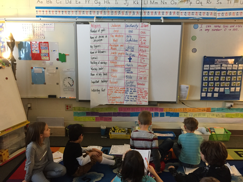 Students love learning about religion. We have studied Judaism, Christianity and Islam. In addition to learning about these religions, the students have learned about looking at charts, inferring information, finding similarities and differences with the information on the chart. We have been practicing making statements true or false for our peers and using the chart to decide if they are in fact true or false. They love trying to trick their peers.